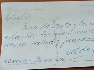 Lee la tarjeta que dice: “Chiche, para usted, Tito y los muchachos, les envío mis deseos de salud y felicidad. Aldo”. La misma está fechada el 20 de octubre de 1970 en Génova. Se trata de una tarjeta que tiene 55 años y está intacta.