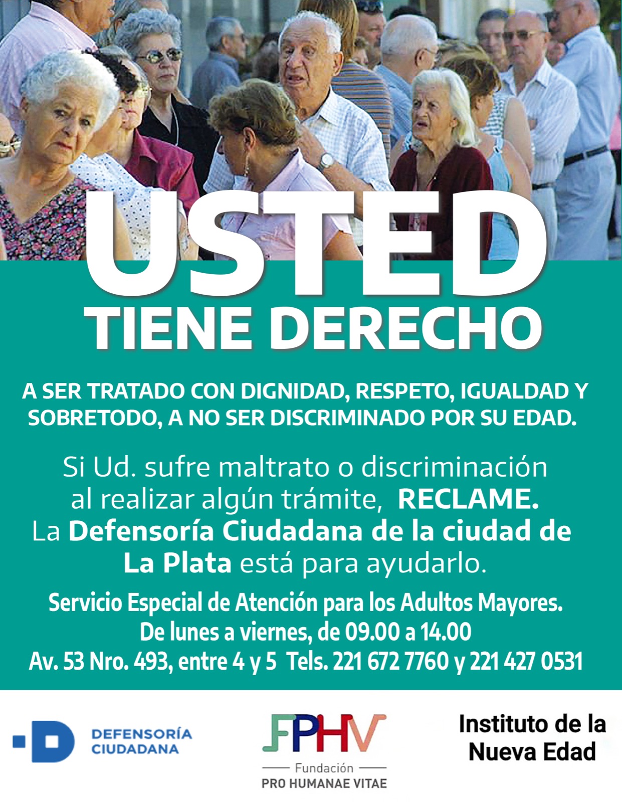 El Instituto de la Nueva Edad (INE), que desarrolla sus actividades en el marco de la Fundación Pro Humanae Vitae, recordó que está en pleno funcionamiento en la Defensoría Ciudadana de La Plata el servicio especial de atención para adultos mayores que hayan sufrido maltrato en alguna repartición pública, establecimientos de salud, entidades bancarias o de otros servicios, etc.